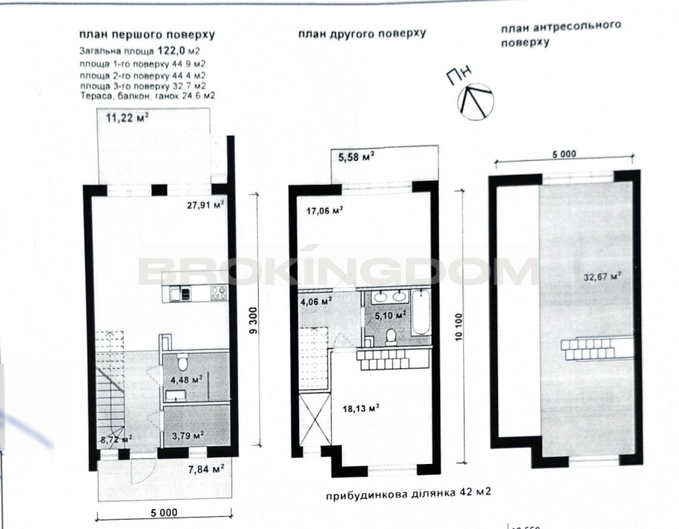 Загальна площа 122 кв. м (3 поверхи), прибудинкова ділянка 42 кв. м для терасі або зони барбекю.