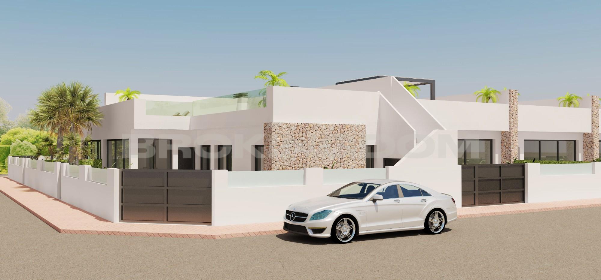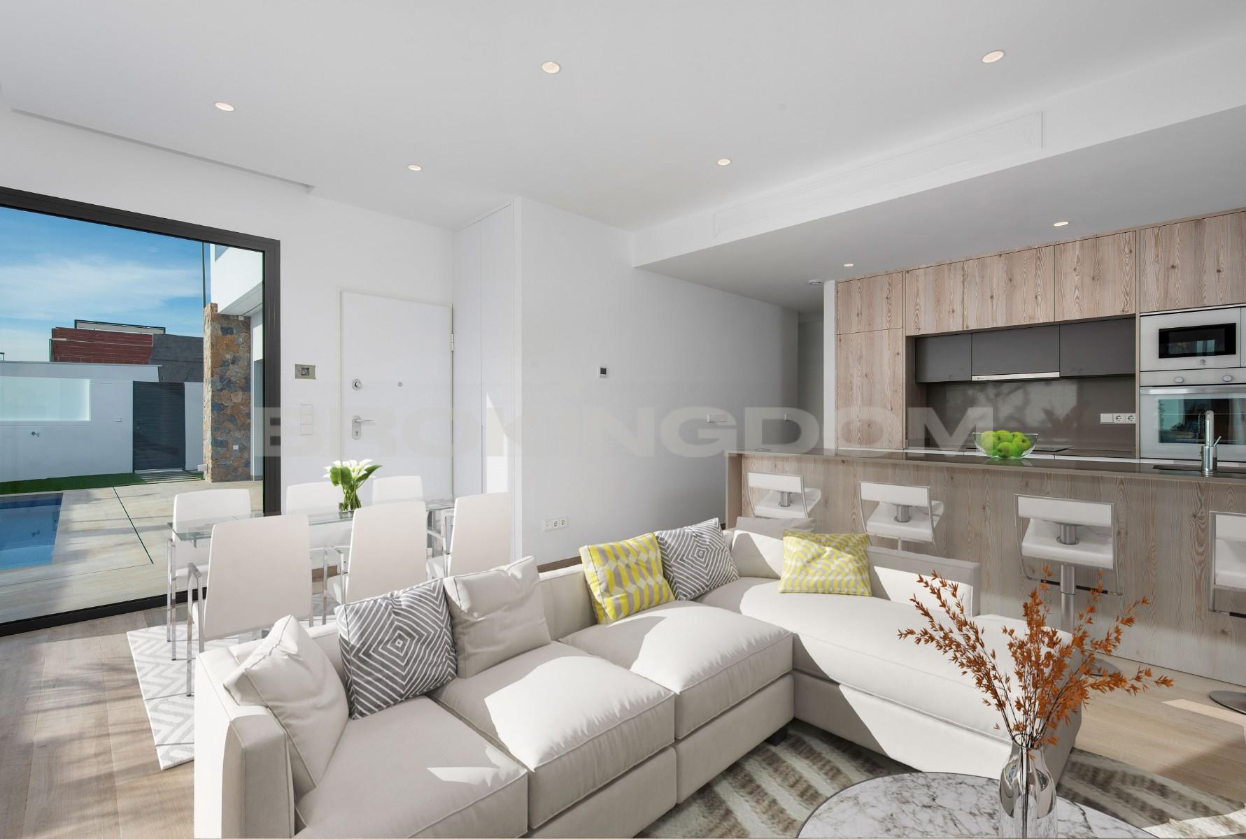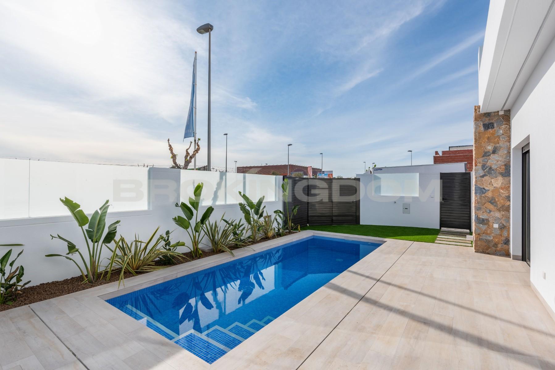 This luxury villa is finished and ready to move into and includes all furniture, hot/ cold air conditioning, LED lighting, landscaped garden with private pool and modern kitchen with fitted appliances.This luxuryvilla is built all on one level and consists of a lounge/diner with patio doors leading out into the garden and terrace with a private swimming pool, an open plan modern kitchen with fitted appliances including oven, hob, extractor, fridge/freezer and microwave.There is a master bedroom with fitted wardrobes, en suite bathroom with access to an internal patio, another double bedroom with fitted wardrobes and a guest bathroom. There is a staircase which leads up to a huge 80 m² private rooftop solarium.Each villa includes private swimming pool, finished garden with irrigation system, complete bathrooms with shower screens, kitchen appliances, rooftop solarium and LED lighting throughout the house.The Pilar de la Horadada area is a well established Spanish town and has a great selection of shops, bars and restaurants. It is situated only a few kilometres to the beautiful beaches of Torre de la Horadada which has a lovely marina and promenade to enjoy a glass of wine in the sun by the beach. The development is only a few kilometres away from the Lo Romero golf resort.