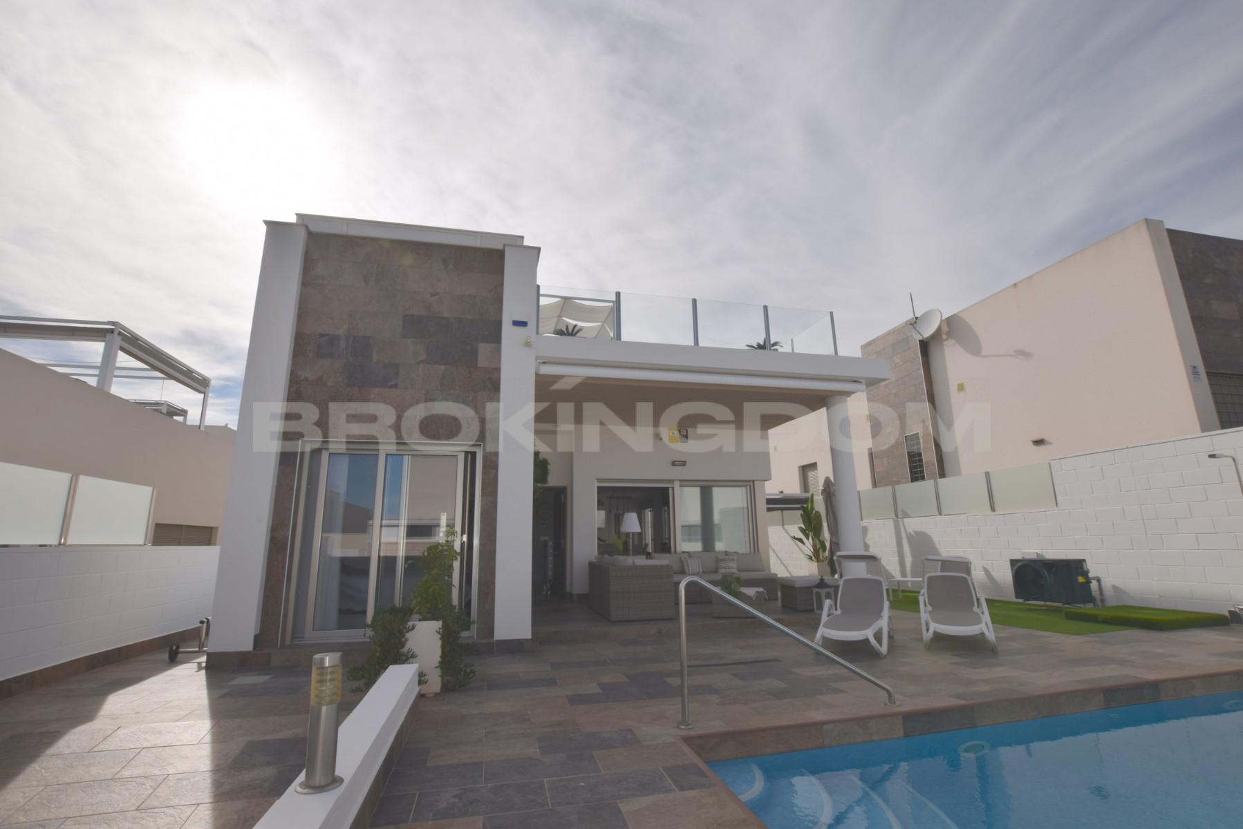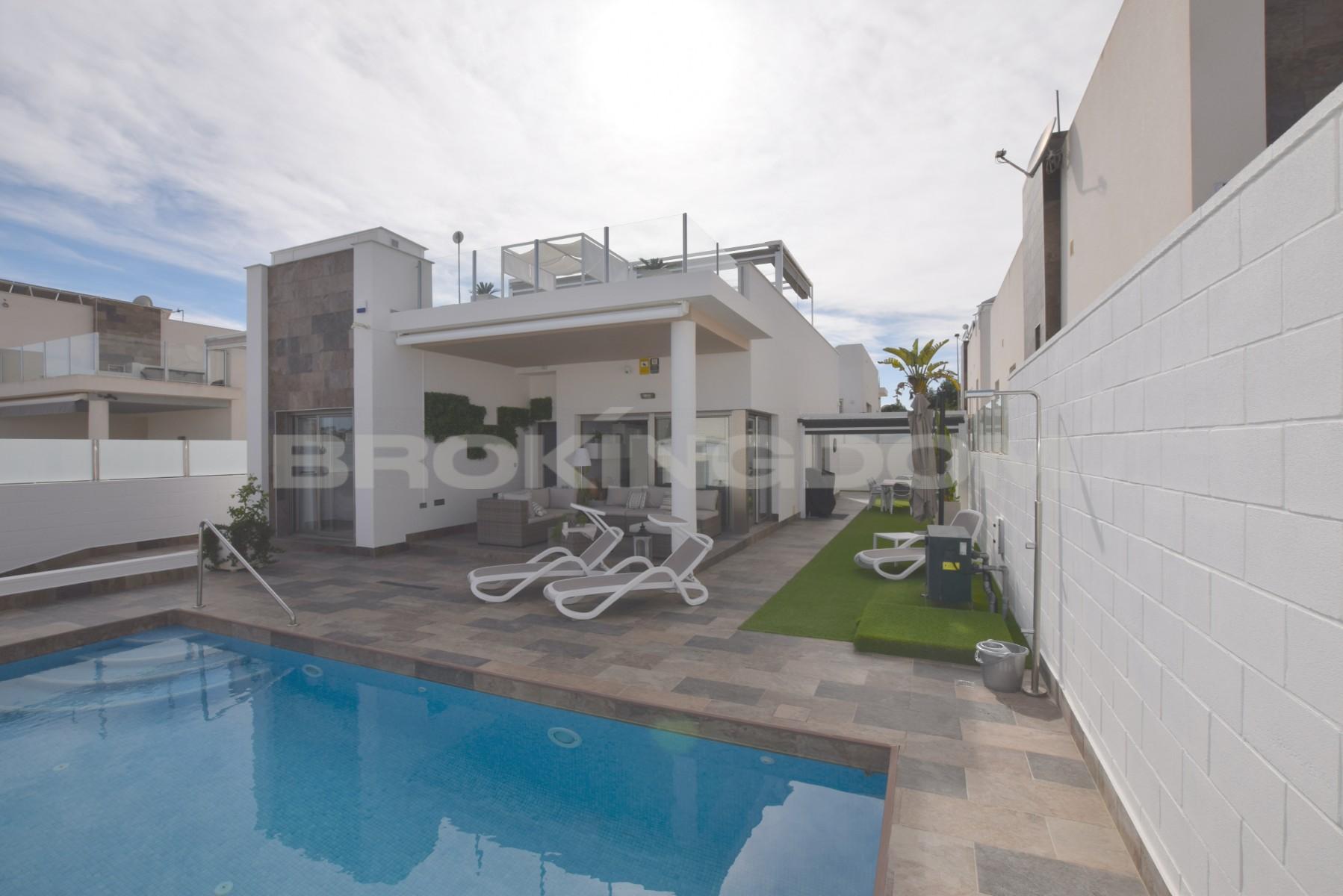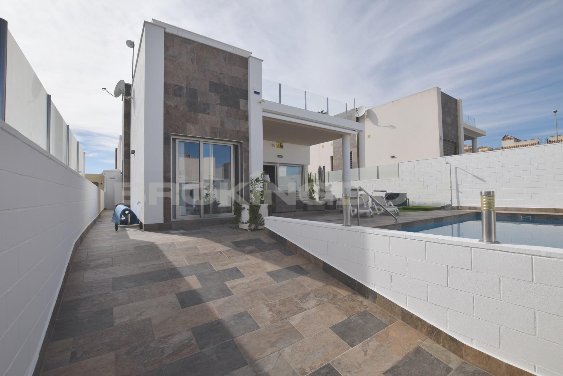 This luxurious modern one level villa was built only 4 years ago on a private road in Villamartin, situated in a mature residential area close to local amenities including the ever popular Villamartin plaza and a short drive to the beaches of La Zenia and Punta Prima.