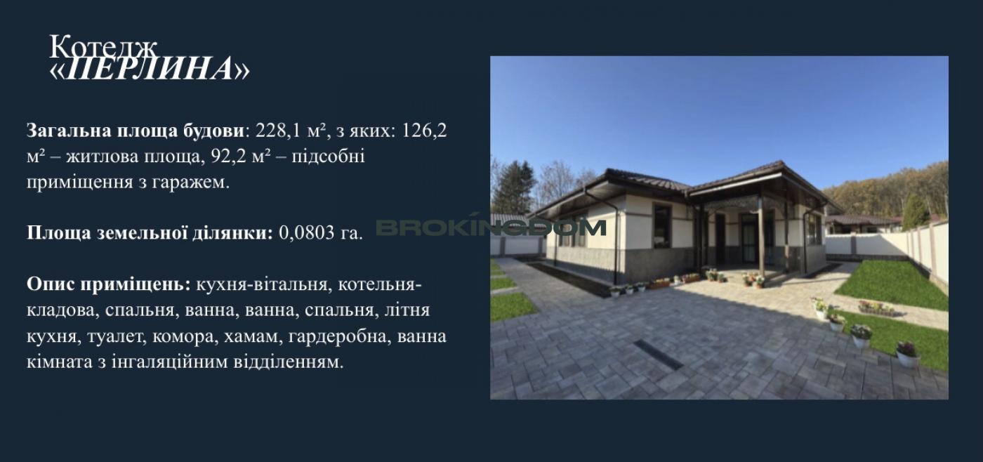 Опис приміщень: коридор, підсобне приміщення, ванна, кухня, вітальня, сходова, кладова, кабінет, коридор, санвузол, гардеробна, санвузол, закрита стоянка для автомобіля на одне паркувальне місце.